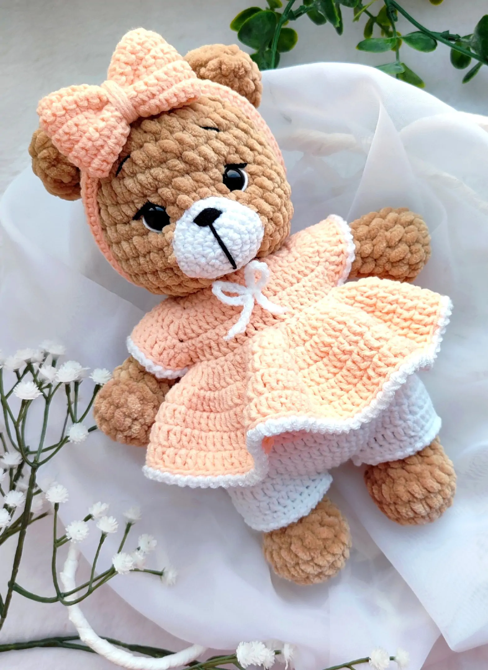 Бесплатный мастер-класс от Юлии @julia_knitting11 по вязанию плюшевой мишки в платье крючком. Размер вязаной игрушки примерно 24 см. Для изготовления такого медвежонка автор использовала плюшевую пряжу YarnArt Dolce с плотностью 120м/100г, полухлопковую YarnArt Jeans и крючки 4 и 2 мм. Голова и тело игрушки вяжутся одной деталью, ручки и ножки ввязываются в процессе вязания, остальные части пришиваются. Из описания схемы вы также узнаете как связать платье, шортики и повязку с бантиком для украшения нашей мишки.