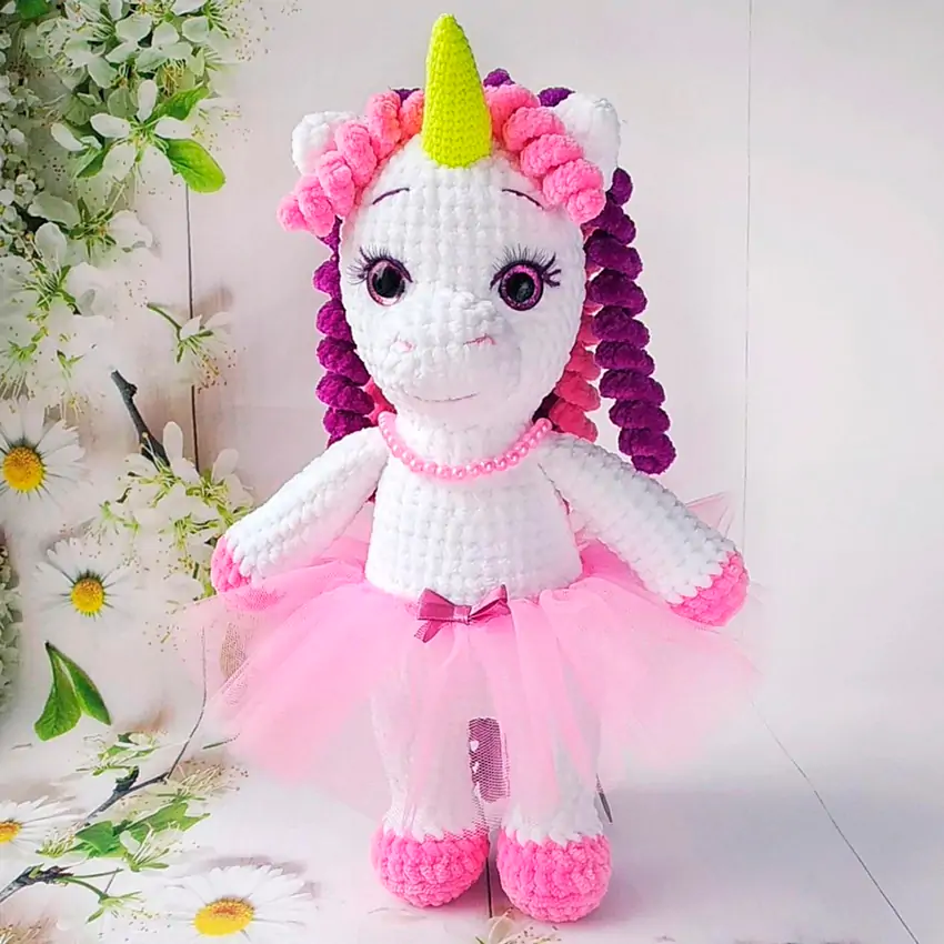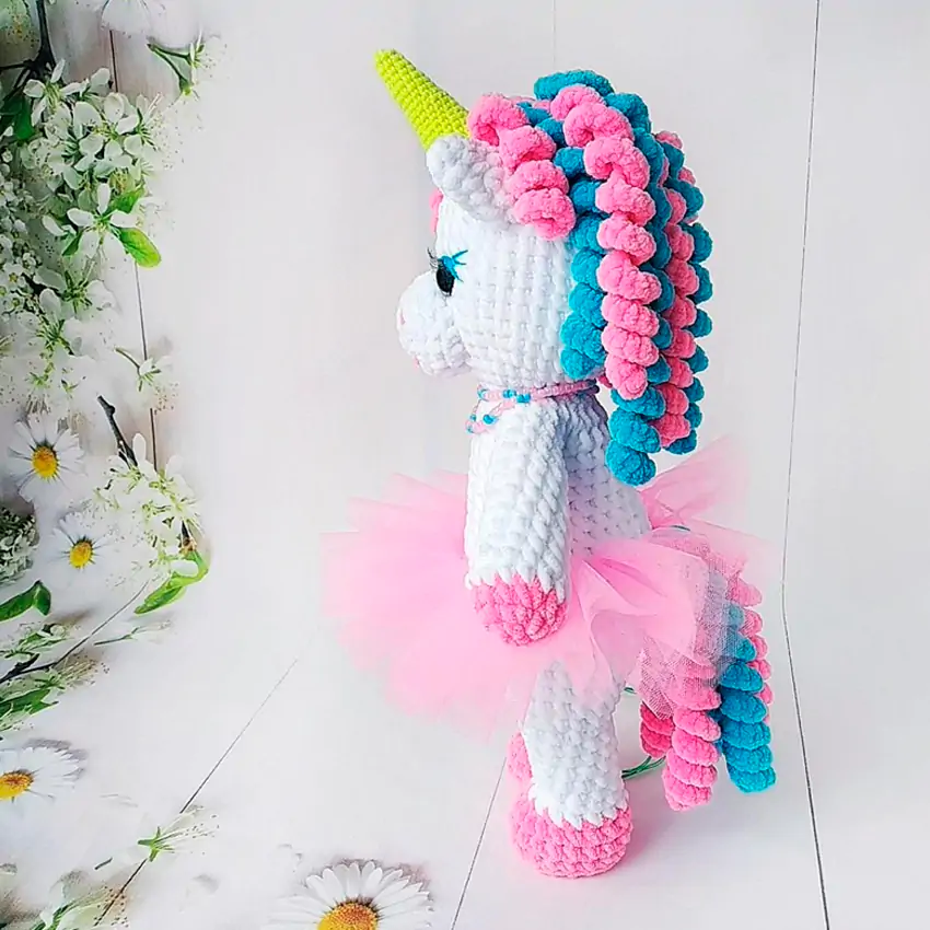 Мастер-класс по вязанию единорога Алисы от Елены Панцыревой. Размер готовой игрушки зависит от используемых материалов: при работе с плюшевой пряжей и плотном вязании столбиками без накида по принципу "галочки" игрушка получается около 30 см в высоту (без учета рога). Если использовать полухлопковую пряжу YarnArt Jeans (50 г/165 м) с крючком 2-2,5 мм, размер единорожки составит 17-18 см. Особое внимание уделяется рогу: для мини-версии его рекомендуется вязать из пряжи Ирис более тонким крючком 1-1,25 мм. В зависимости от выбранного материала меняется не только размер, но и внешний вид игрушки: плюшевый вариант получается более мягким и объемным, а полухлопковый - более изящным и детализированным. Описание включает все этапы работы от туловища до мелких деталей, с особым вниманием к оформлению гривы, хвоста и рога.