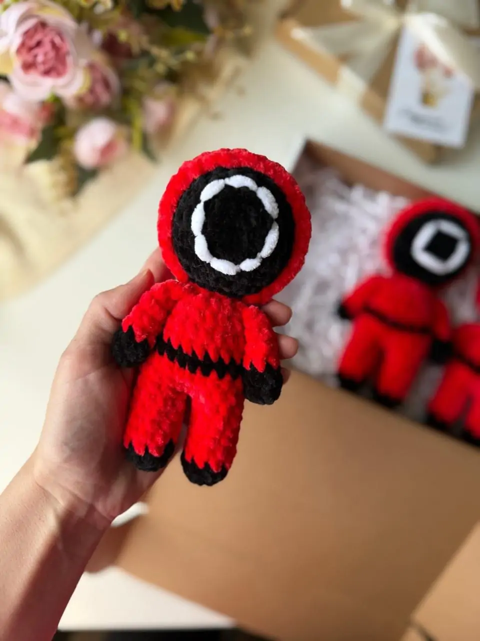 Бесплатный мастер-класс от Алёны Селецкой по вязанию плюшевого охранника из сериала "Игра в кальмара". Размер готовой игрушки около 17 см. Использована мягкая плюшевая пряжа Wolans Bunny Baby с крючком 4 мм. Основная часть (ноги, туловище и голова) вяжется как единое целое, что обеспечивает прочность конструкции. Руки ввязываются в процессе работы, капюшон пришивается отдельно. Мастер-класс включает подробные инструкции по созданию узнаваемого образа персонажа: формированию характерного силуэта в костюме, оформлению маски и других деталей.