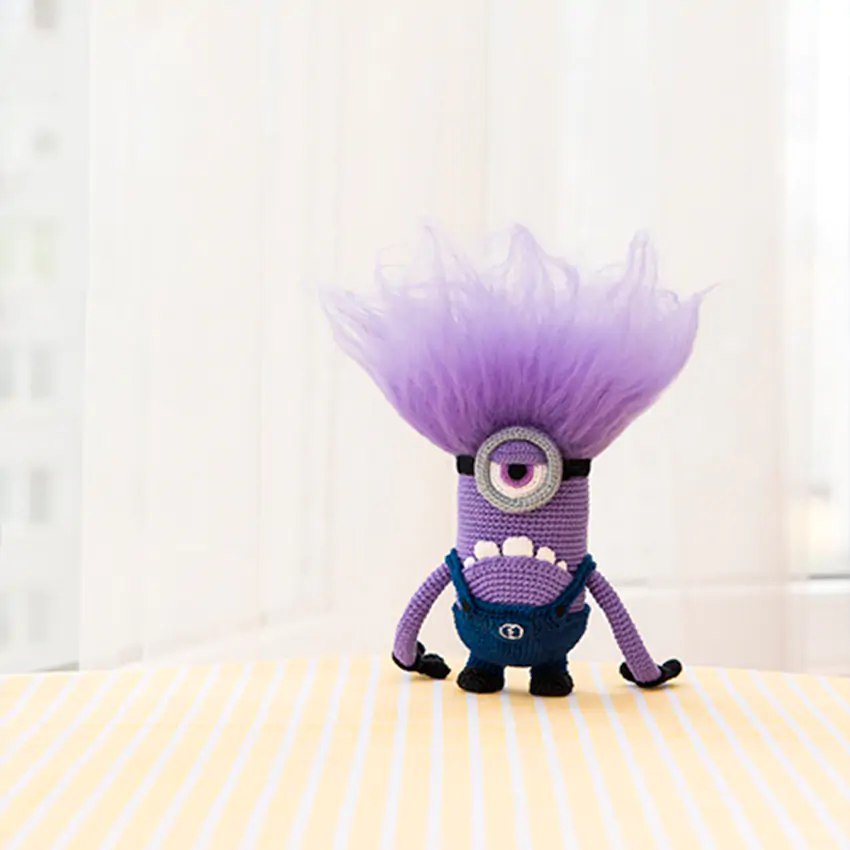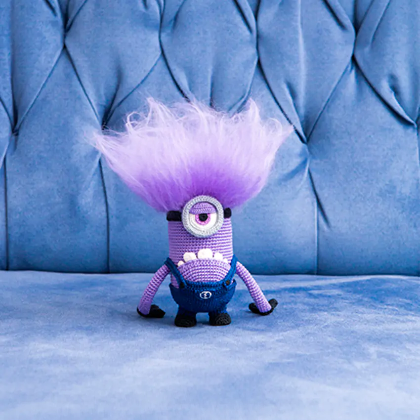 Бесплатный мастер-класс от AradiyaToys по вязанию Злого Миньона из мультфильма "Гадкий Я". Размер готовой игрушки - около 17 см. Для работы вам понадобится: пряжа "Iris" и "Camomile" Кировской пряжи (100% хлопок), крючки 0.75 мм, 1.00 мм и 1.25 мм, наполнитель, швейная игла, кусочек фиолетовой шерсти для деталей. Тело и голова вяжутся как единая деталь, характерные элементы (очки, костюм) выполняются отдельно. Уровень сложности - средний, требует аккуратности при работе с тонкими крючками. Готового Злого Миньона можно использовать как оригинальный подарок для поклонников мультфильма.